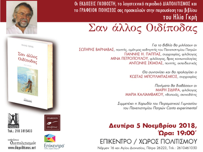 Οι Εκδόσεις Γκοβόστη, το λογοτεχνικό περιοδικό διαπολιτισμός και το Γραφείον Ποιήσεως συνδιοργανώνουν την παρουσίαση του βιβλίου του Ηλία Γκρή «Σαν Άλλος Οιδίποδας» τη Δευτέρα 5 Νοεμβρίου 2018, στις 19:00 το απόγευμα, στο Επίκεντρο+ στην οδό Νόρμαν 16 και Αγίου Διονυσίου, στην Πάτρα.