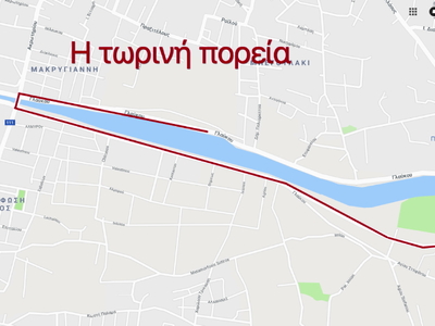 Νταλίκα ετοιμάζεται να μπει από την Ακρωτηρίου στην Παραγλαύκεια άνοδο. Εχει πιάσει όλο το μήκος της Ακρωτηρίου πάνω στο ποτάμι μεταξύ των δύο αρτηριών, αλλά και τις δύο λωρίδες κυκλοφορίας.