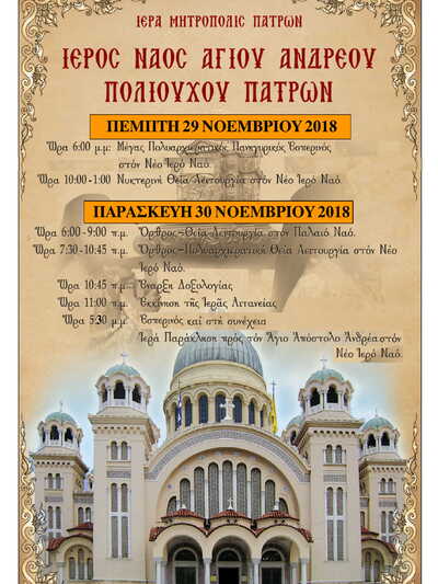 Η επίσημη Δοξολογία έχει οριστεί για τις 10.45 το πρωί της Παρασκευής 30/11/2018 και μετά τις 11 υπολογίζεται να πραγματοποιηθεί η λιτανεία και μετά τις 12.30 το μεσημέρι το επίσημο γεύμα από τον Μητροπολίτη Πατρών στο ξενοδοχείο Patra Palace στην Όθωνος Αμαλίας.