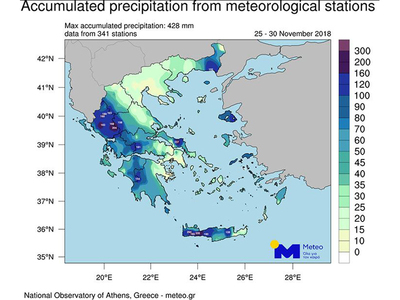 Σύμφωνα με το δίκτυο αυτόματων μετεωρολογικών σταθμών του Εθνικού Αστεροσκοπείου Αθηνών / Meteo.gr, το πυκνότερο δίκτυο μετεωρολογικών σταθμών στην Ελλάδα, ο απολογισμός του ύψους βροχόπτωσης της κακοκαιρίας «Πηνελόπη» σε ολόκληρη τη χώρα παρουσιάζεται στον παρακάτω χάρτη.