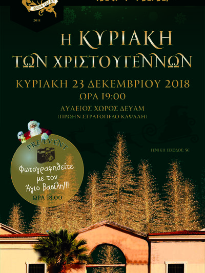 Ο Μουσικός Όμιλος της Ιεράς Πόλης Μεσολογγίου «Ιωσήφ Ρωγών» στις 23 Δεκεμβρίου 2018 στις 19:00 θα παρουσιάσει την μουσικοχορευτική παράσταση «Η Κυριακή των Χριστουγέννων» στον αύλειο χώρο της ΔΕΥΑΜ (πρώην στρατόπεδο Καψάλη).