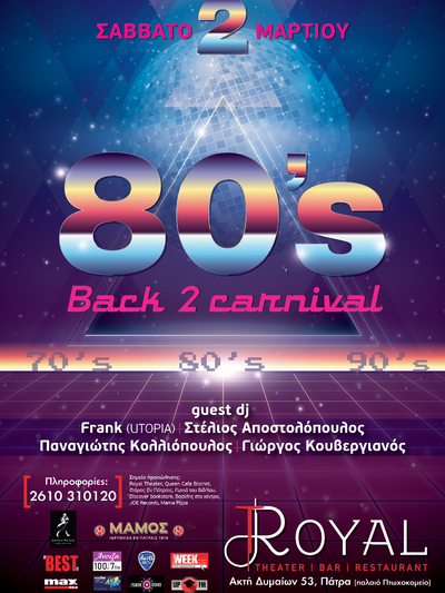Ένα από τα πιο αναμενόμενα καρναβαλικά και original classic parties, το 80’s back to carnival ετοιμάζεται πυρετωδώς και θα γίνει αυτό το Σάββατο 2 Μαρτίου 2019. Η κεντρική αίθουσα του Royal – παλαιό Πτωχοκομείο στην Ακτή Δυμαίων, πάει πίσω στο χρόνο και θα γεμίσει με μελωδίες από τις δεκαετίες των ’70’s, 80’s και 90’s προσεκτικά επιλεγμένες από τους μετρ του είδους.