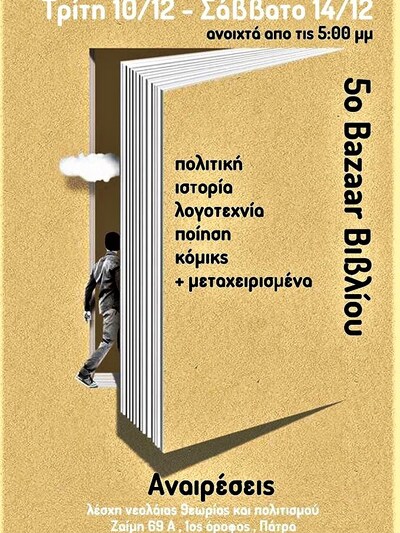 Η Λέσχη Αναιρέσεις Πάτρας οργανώνει και φέτος το 5ο Bazaar Βιβλίου, από την Τρίτη 10/12 μέχρι και το Σάββατο 14/12 με δεκάδες εκδόσεις καθώς και μεταχειρισμένα βιβλία.