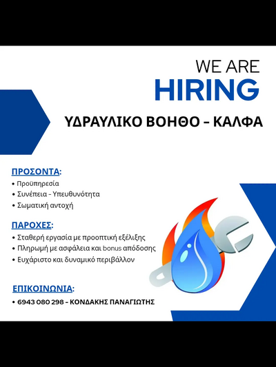 Ζητείται βοηθός υδραυλικού για μόνιμη εργασία στην περιοχή της Αχαΐας.
