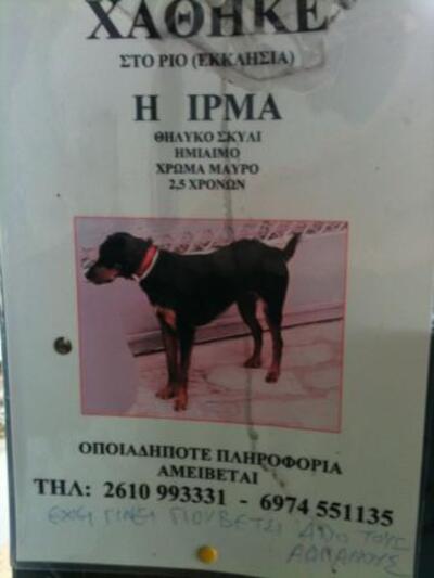 Στην περιοχή του Ρίου, είναι αρκετές οι αυτοσχέδιες αφίσες που σκοπό έχουν να δώσουν στοιχεία για ένα σκύλο που χάθηκε και για τον οποίο οι ιδιοκτήτες του ζητούν πολλές φορές έναντι αμοιβής, πληροφορίες προκειμένου να τον εντοπίσουν. Έτσι και για την Ιρμα που χάθηκε στην περιοχή του Αγίου Γεώργιου στο Ριον.