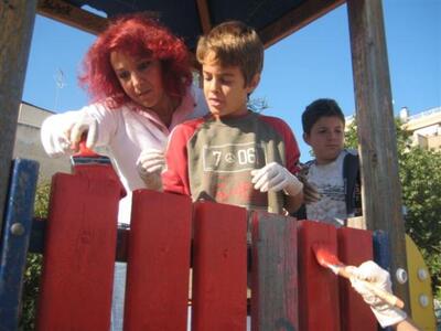 Αποκαταστάθηκαν οι ζημιές στα πολυόργανα της παιδικής χαράς με υλικά και εξαρτήματα που βρίσκονταν πεταμένα στις αποθήκες του δήμου και βάφτηκαν με τα βασικά μόλις χρώματα μπλε, κόκκινο, κίτρινο.