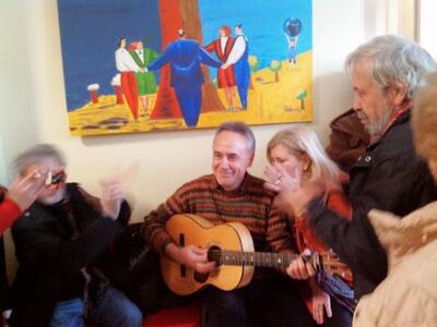 Στην πένα και την κιθάρα τον διαδέχτηκε ο Γιάννης σε μια ζεστή ατμόσφαιρα με πλήθος κόσμου, όπου η Καίτη Τσαρουχά -η διευθύντρια της κουζίνας- είχε ετοιμάσει ένα gourme τραπέζι με σουβλάκια, σμυρναϊικα σουτζουκάκια και πλήθος ορεκτικών. Ο λευκός και ερυθρός οίνος έρρεε άφθονος.