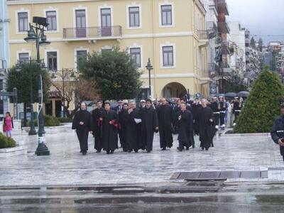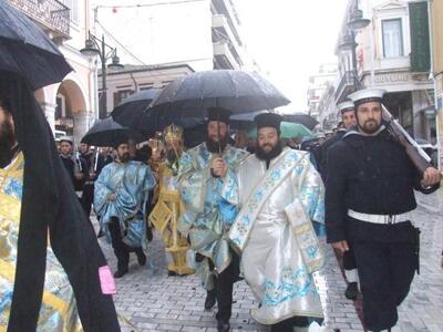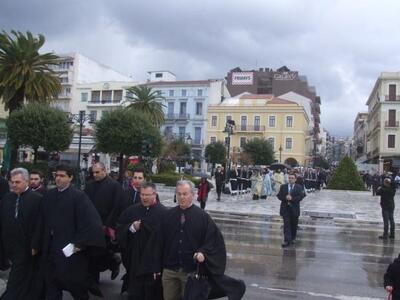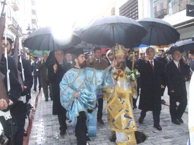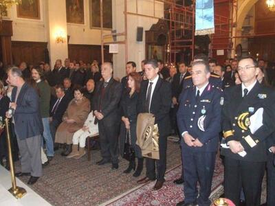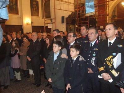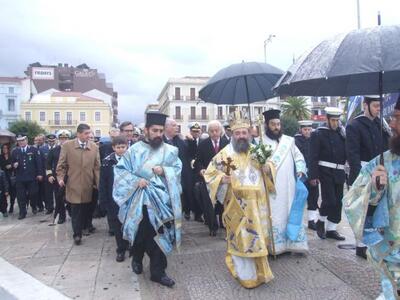Νωρίτερα, τελέστηκε στο Ναό της Ευαγγελίστριας παρουσία των αρχών της πόλης Θεία Λειτουργία και τον Μεγάλο Αγιασμό.