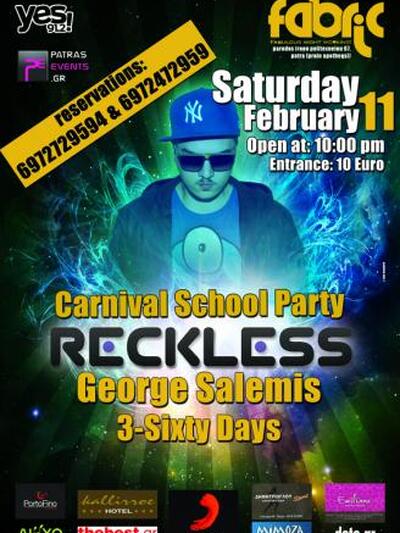 Το Σάββατο 11 Φεβρουαρίου 2012 έρχεται στο Fabric Clup της Πάτρα ο γνωστός Ερμηνευτής - Παραγωγός «Reckless» σε συνεργασία με τον έφηβο πατρινό τραγουδιστή Σαλεμή Γιώργο και τους 3-Sixty Days στα πλαίσια ενός μεγάλου σχολικού γεγονότος που δεν είναι άλλο από το «Carnival School Party 2012».