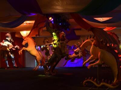 Στον εξωτερικό στεγασμένο χώρο ένα μεγάλο παγοδρόμιο μας προκαλεί να …χορέψουμε στον πάγο, ενώ το καρουσέλ, το τραμπολίνο και το τρενάκι, όλα σε στεγασμένο και καρναβαλικά διακοσμημένο χώρο συμπληρώνουν την παιχνιδούπολη.