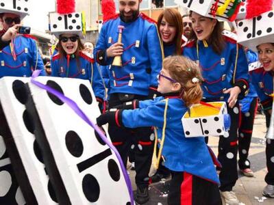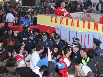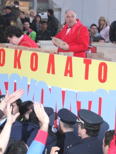 Στο τέλος της παρέλασης το αναλλοίωτο στο πέρασμα του χρόνου έθιμο του σοκολατοπόλεμου γλύκαινε ντόπιους και επισκέπτες προκαλώντας τον ενθουσιασμό τους.