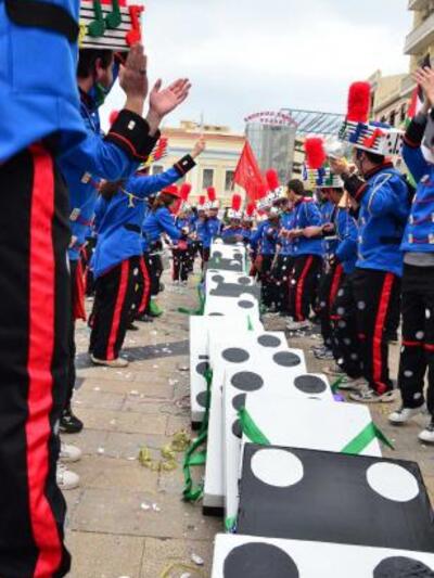 Στην κορυφή της παρέλασης οι αγανακτισμένοι των λαϊκών συνελεύσεων της πόλης έδωσαν μια αίσθηση διαδήλωσης φωνάζοντας συνθήματα για τη σημερινή κατάσταση. Στη συνέχεια η μεταμφιεσμένη Μπάντα του Δήμου Πατρέων παιανίζοντας γνωστά αποκριάτικα τραγούδια και οι μαζορέτες από σχολή χορού της πόλης με τη φρεσκάδα τους μας έδωσαν την πρώτη γεύση για να ακολουθήσουν οι Κουδουναραίοι του Μαρτυρικού Δίστομου και όλων των πόλεων της Ευρώπης που έσφαξαν οι Γερμανοί ναζιστές, ο Καρνάβαλος, και το άρμα της Βασίλισσας με την ακολουθία τους(σατιρικά άρματα Δήμου, άρματα του Καρναβαλιού των Παιδιών και μεταμφιεσμένοι).