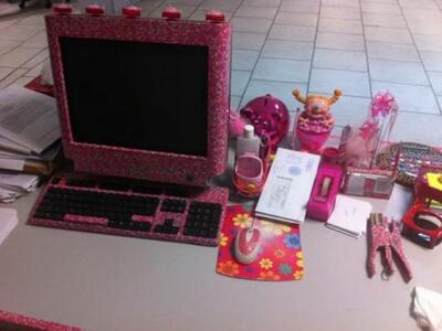Από πάνω έως κάτω το χρώμα του ροζ κυριαρχεί ενώ ακόμη και το πληκτρολόγιο έχει ντυθεί στα αγαπημένα χρώματα της υπαλλήλου.