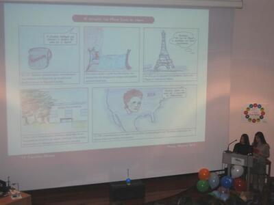 Η Ομάδα μαθητών του 13ου Γυμνασίου Πατρών με υπεύθυνη την καθηγήτρια Γαλλικής φιλολογίας κα Βασιλική Παπαγιάννη, παρουσίασε τη δημιουργία ενός κόμικ με θέμα «Η ζωή της Μαρίας Κιουρί σε κόμικ μέσα από τα μάτια των μαθητών του 13ου Γυμνασίου Πατρών». Κατά την παρουσίαση, το κόμικ ζωντάνεψε με μια σκηνή ανάμεσα στη Μαρία Κιουρί και την κόρη της που οι μαθητές έπαιξαν στα γαλλικά.