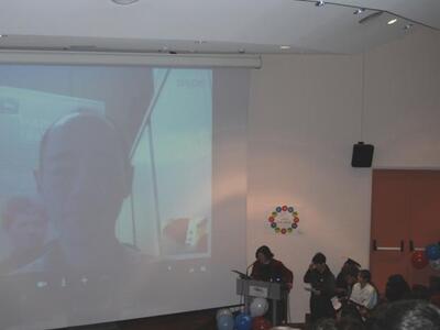 Στο πλαίσιο της εκδήλωσης πραγματοποιήθηκε Τηλεδιάσκεψη με το Δ/ντή του Μουσείου Κιουρί στο Παρίσι Δρ Huynh Van Nhan Renaud, ο οποίος απάντησε σε ερωτήσεις που είχαν προετοιμάσει οι μαθητές που συμμετείχαν, στα Γαλλικά, σχετικά με τη ζωή και το έργο της Μαντάμ Κιουρί. Η εκδήλωση μεταδόθηκε online και την παρακολούθησαν μαθητές από απομακρυσμένα σχολεία της Αχαΐας και άλλες περιοχές της Ελλάδας, χωρίς να χρειαστεί να μετακινηθούν.
