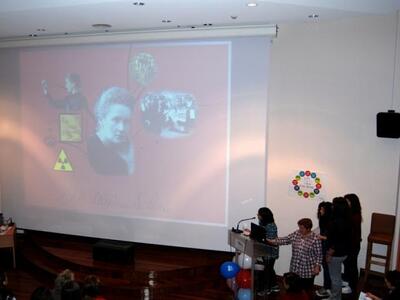 Τέλος, η Ομάδα μαθητών του Πρότυπου Πειρ/κού Λυκείου με υπεύθυνους καθηγητές τους Μαρία Αργυροπούλου, Κοιν/λόγο, Παναγιώτη Γάκη, Φιλόλογο και Ευαγγελία Κουνάβη, καθηγήτρια Πληρ/ρικής σκιαγράφησαν τη συμβολή της Μαντάμ Κιουρί στο Γυναικείο κίνημα μέσα από παρουσίαση με τίτλο «Ra+soutien-gorge → υποστηριζόμενη απελευθέρωση ↑, ΔH<0».