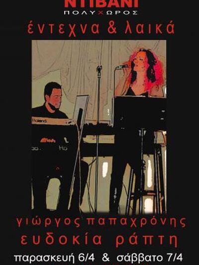 Στον πολυχώρο "Ντιβάνι" θα εμφανιστεί την Παρασκευή 6 και το Σάββατο 7 Απριλίου η γνωστή τραγουδίστρια Ευδοκία Ράπτη σε ένα έντεχνο-λαϊκό πρόγραμμα. Την Ευδοκία θα συνοδεύει στο πιάνο και στα πλήκτρα ο Γιώργος Παπαχρόνης.