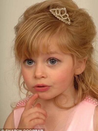 Η μικρούλα που βλέπεις στη φωτογραφία φοράει γαλάζια σκιά για να πηγαίνει με τα γαλάζια μάτια της, μάσκαρα, λιπγκλός και μια τιάρα στολίζει τις μπούκλες της που έχουν φτιαχτεί με ηλεκτρικό ψαλίδι.