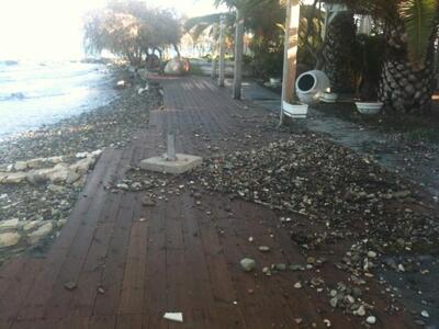 Το κύμα σκάει στο δρόμο όπου μαζί με τα νερά βγαίνουν και πέτρες. Όπως αναφέρει ο αρμόδιος αντιδήμαρχος για την Πολιτική Προστασία Αχιλλέας Γεωργακόπουλος σήμερα στη 1 το μεσημέρι στο γραφείο του έχει προγραμματιστεί συνάντηση με εκπροσώπους των εμπλεκομένων φορέων (Περιφέρεια, Κτηματικη) προκειμένου να αναζητηθούν λύσεις μιας και ο αιγιαλός ανήκει στη ζώνη ευθύνης της Κτηματικής.