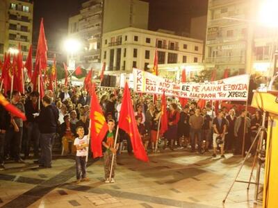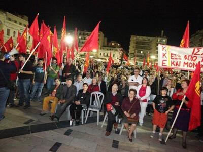 Μέλη του ΚΚΕ πραγματοποίησαν νωρίτερα πορεία στο κέντρο της πόλης κατευθυνόμενα προς το σημείο της συγκέντρωσης.