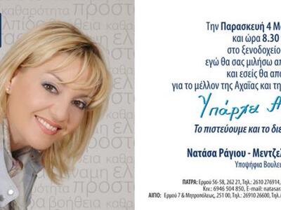 Την Παρασκευή 4 Μαΐου 2012 και ώρα 8.30 το βράδυ, στο ξενοδοχείο Αστήρ, η υποψήφια βουλευτής ΝΔ, Νατάσα Ράγιου-Μεντζελοπούλου θα μιλήσει από καρδιάς για το μέλλον της Αχαΐας και της Ελλάδας.