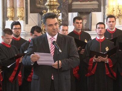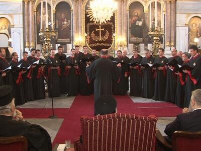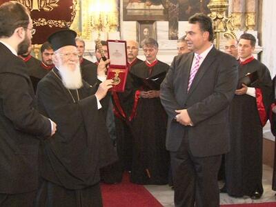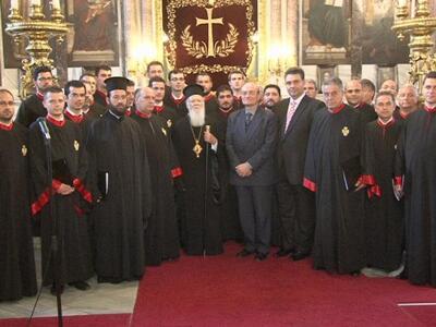 Ο Βυζαντινός χορός κατόπιν απέδωσε άριστα και σύμφωνα με το Πατριαρχικό ύφος επιλεγμένα μέλη τόσο από την Υμνολογία του Πάσχα όσο και από όλο το Εκκλησιαστικό έτος , συμπεριλαμβανομένων και ύμνων των Μεγάλων Ιεροψαλτών της Κωνσταντινουπόλεως, υπό την διεύθυνση του χοράρχη του Μουσικολογιωτάτου Πρωτοψάλτου, κ.Χαραλάμπους Θεοτοκάτου. Η ορθή εκτέλεση των Βυζαντινών μελών, η αρμονία μέλους και ισοκρατήμαστος και η άριστη ακουστική του ναού, δημιούργησαν ένα μεγαλειώδες, μελωδικό και συγκινητικό ηχητικό αποτέλεσμα, που απέσπασε το θερμότατο χειροκρότημα όλων των παρευρισκομένων. Κλείνοντας την εκδήλωση, ο Παναγιώτατος Οικουμενικός Πατριάρχης κ.κ. Βαρθολομαίος ευχαρίστησε τον Βυζαντινό χορό για την σημερινή «συγκινητικά εξαίσια» συναυλία του, συνεχάρη τους κυρίους Βέργο και Θεοτοκάτο και τα μέλη του χορού για την πολιτιστική 7ετή τους προσφορά, ενώ ευχήθηκε ανάλογη συνέχεια και πλήρη ευόδωση των ευγενών σκοπών τους.Ακόμη, έστειλε συγχαρητήρια και ευχαριστίες στον Σεβασμιώτατο Πατρών, θεωρώντας τον ιδιαίτερα τυχερό που διαθέτει η πόλη του τόσο καλές χορωδίες και ολοκλήρωσε την ομιλία του αναφερόμενος στην μεγάλη εορτή της ημέρας. Μετά το πέρας της ομιλίας του ο Πρόεδρος της Βυζαντινής – Παραδοσιακής χορωδίας «ΘΕΟΔΩΡΟΣ ΦΩΚΑΕΥΣ» έδωσε ένα ιδιαίτερο δώρο στον προκαθήμενο της Ορθοδόξου Εκκλησίας, ελάχιστο δείγμα της ευγνωμοσύνης του χορού για τη τιμητική πρόσκληση και παρουσία του στην σημερινή εκδήλωση, ένα Πατριαρχικό εγκόλπιο φιλοτεχνημένο από ειδικευμένους τεχνίτες της πόλης των Ιωαννίνων με αφιέρωση στο πίσω μέρος του( Τη Αυτού Θειωτάτη Παναγιότητι, Τω Οικουμενικω Πατριάρχη κ.κ. Βαρθολομαίον, υϊκώς Χορωδία«ΘΕΟΔΩΡΟΣ ΦΩΚΑΕΥΣ» 13-05-2012). Συγκινημένος ο Παναγιώτατος ευχαρίστησε τον κ. Βέργο για το όμορφο δώρο, τον ασπάστηκε πατρικώς και στη συνέχεια χαιρέτησε τον χοράρχη, τους χορωδούς και όλα τα μέλη της Ελληνικής αποστολής. Ακολούθησε δεξίωση προς τιμήν της χορωδίας στο Πνευματικό Κέντρο του Ι. Ν. Αγ. Τριάδος Σταυροδρομίου Κωνσταντινουπόλεως.