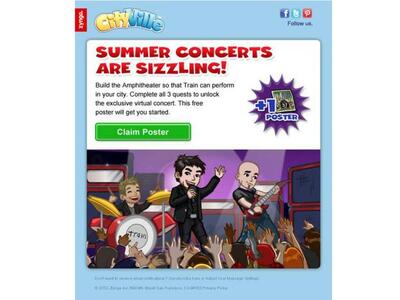 Από σήμερα μέχρι τις 09 Ιουνίου, οι παίχτες του City Ville, θα πρέπει να αποκτήσουν το avatar της μπάντας και να ολοκληρώσουν μια σειρά από δοκιμασίες φτιάχνοντας ένα αμφιθέατρο στην πόλη τους. Αφού το πετύχουν, οι παίκτες θα ξεκλειδώσουν μιαvirtual συναυλία των Train, η οποία οπτικοποιήθηκε την Άνοιξη στο SanFrancisco.