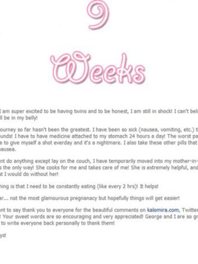 Ένα κείμενο με τον τίτλο «Εννέα εβδομάδες», το οποίο αφορά στην εγκυμοσύνη της και τα δίδυμα που περιμένει, ανήρτησε στην προσωπική της ιστοσελίδα η Καλομοίρα.