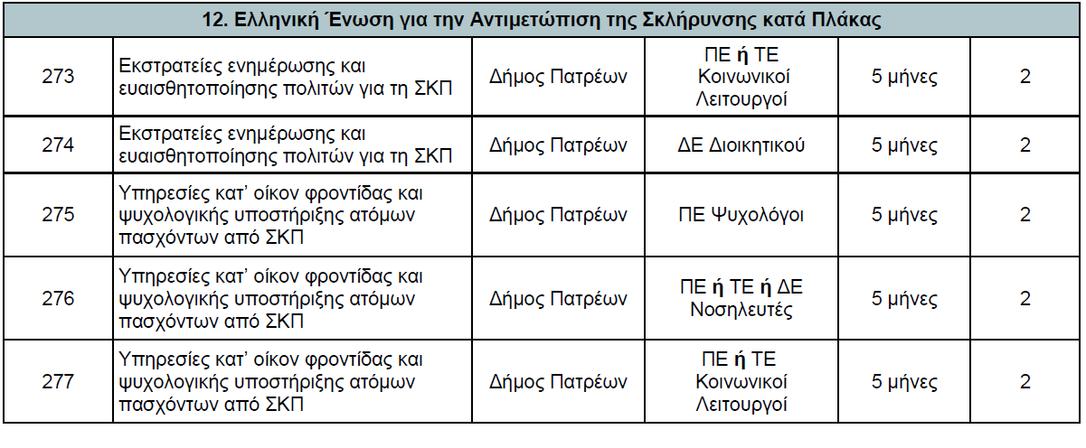 277 - Υπηρεσίες κατ’ οίκον φροντίδας και ψυχολογικής υποστήριξης ατόμων πασχόντων από ΣΚΠ Δήμος Πατρέων: ΠΕ ή ΤΕ Κοινωνικοί Λειτουργοί ΓΙΑ 5 μήνες ΘΕΣΕΙΣ: 2