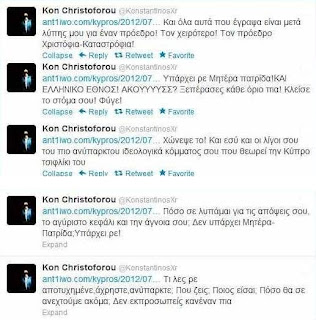 «Χείμαρρος» ήταν, μέσα από τον προσωπικό του λογαριασμό στο twitter, ο Κωνσταντίνος Χριστοφόρου. Ο τραγουδιστής έγινε πυρ και μανία κατά του Πρόεδρου της Κυπριακής Δημοκρατίας, Δημήτρη Χριστόφια. Οι δηλώσεις του για τις «Μητέρες Πατρίδες» ξεχείλισαν το ποτήρι για τον Κωνσταντίνο, ο οποίος «τα έχωσε» άγρια.