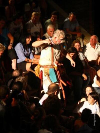 Χωρίς πρόβλημα πραγματοποιήθηκε η χθεσινή 2η παράσταση της επίκαιρης αρχαίας κωμωδίας του Αριστοφάνη «Ιππής» σε σκηνοθεσία Σταμάτη Φασουλή στο Αρχαίο Ωδείο της Πάτρας στο πλαίσιο του Διεθνούς Φεστιβάλ του Πολιτιστικού Οργανισμού του Δήμου. Η βροχή που έπεσε χθες Τρίτη το απόγευμα ήταν ευτυχώς σύντομη και έτσι δεν δημιούργησε πρόβλημα στους διοργανωτές του Διεθνούς Φεστιβάλ και στην παράσταση που γέμισε για δεύτερο συνεχές βράδυ το Αρχαίο Ωδείο. Ο Πέτρος Φιλιππίδης ως Αλλαντοπώλης ήταν απολαυστικός και «όργωσε» στην κυριολεξία το κοίλον αλλά και τις κερκίδες του Ωδείου όπως αποδεικνύει και η φωτογραφία.