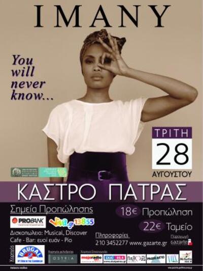 Υποδεχτείτε την Imany στην Πάτρα, στις 28 Αυγούστου, στο Κάστρο, ζωντανά, για μία ακόμα συγκλονιστική εμφάνιση. You will never know..για όσους την είδαν και για όσους δεν πρόλαβαν να την δουν αξίζει να γνωρίσουν από κοντά ένα αληθινό αστέρι την στιγμή που γεννιέται!