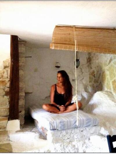 Η παρουσιάστρια απολαμβάνει το κρεβάτι της που δεν είναι άλλο παρά ένα στρώμα σε μια υπέροχη πέτρινη βίλα στη Λευκάδα.
