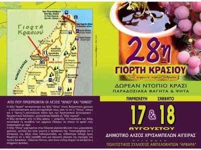 Για 28η χρονιά διοργανώνεται και φέτος στα Χρυσάμπελα Αιγείρας η γιορτή κρασιού.
