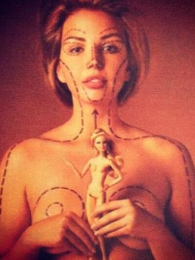 Μια πανέμορφη γυναίκα, σημαδεμένη σε πρόσωπο και σώμα με τον μαρκαδόρο του πλαστικού χειρουργού, λίγο πριν την κόψει το νυστέρι. Κρατά στα χέρια της μια πλαστική κούκλα.