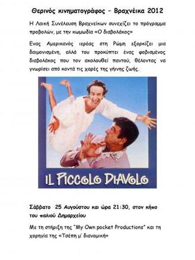 Η Λαϊκή Συνέλευση Βραχναιίκων συνεχίζει το πρόγραμμα προβολών , με την κωμωδία "Ο διαβολάκος". Η προβολή της ταινίας θα γίνει το Σάββατο 25 Αυγούστου στις 09.30 μ.μ. στον κήπο του Παλιού Δημαρχείου.