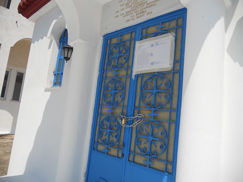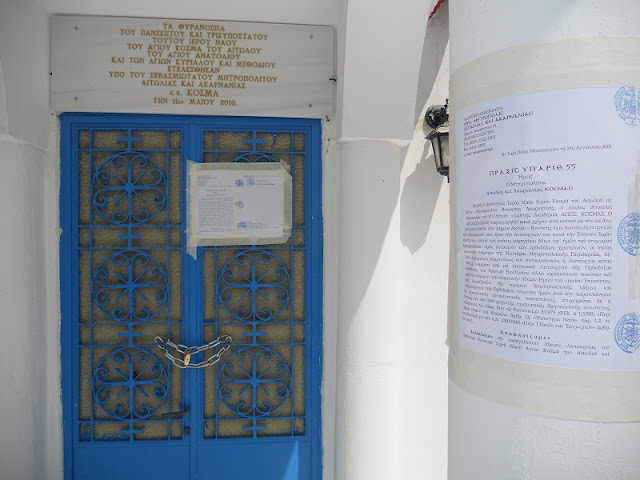 Η αστυνομία χθες βράδυ τοποθέτησε λουκέτα και σφράγισε το Ναό Αγίου Κοσμά του Αιτωλού στα Παλιάμπελα Βόνιτσας. Οι Αστυνομικοί από το Αστυνομικό τμήμα Βόνιτσας ως όριζε η διαδικασία αφού πρώτα τοιχοκόλλησαν την υπ’ αριθμ. 55/16.8.2012 Πράξη του Μητροπολίτη Αιτωλίας και Ακαρνανίας κ. ΚΟΣΜΑ με την οποία ανακαλεί την άδεια λειτουργίας του ιδιωτικού ιερού Ναού Αγίου Κοσμά του Αιτωλού στα Παλιάμπελα Βόνιτσας και «απαγορεύει ρητώς την εφεξής λειτουργία του, διατάσσοντας αρμοδίως το κλείσιμο αυτού», στη συνέχεια σφράγισαν το ναό, αφού τοποθέτησαν αλυσίδες με λουκέτα και στις 3 εισόδους του.