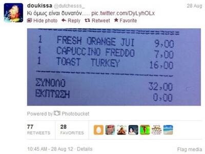 Κι ενώ ο τουρισμός στενάζει υπό το βάρος της οικονομικής κρίσης, κάποιοι συνεχίζουν στους παλιούς τους ρυθμούς και χρεώνουν ένα τοστ 16 ευρώ, ένα χυμό πορτοκάλι 9 ευρώ και έναν καφέ 7 ευρώ!