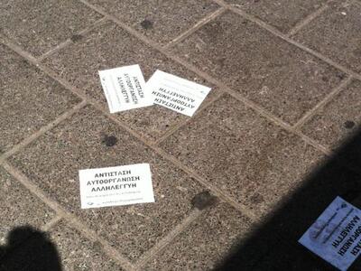 Αντιπροσωπεία των αντιεξουσιαστών ανέβηκε στον πρώτο όροφο του Δημαρχείου, φώναξε συνθήματα και αποχώρησε, ενώ ενημερώνει τους Πατρινούς για την κατάσταση, πετώντας φυλλάδια.