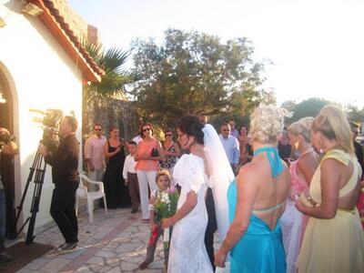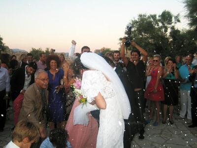 Το ζευγάρι πάντρεψε η Μαρία Κακαβάνη η οποία φορούσε ένα αέρινο μπλε φόρεμα.