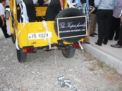 Εντυπωσιακή ήταν έξοδος του ζευγαριού από την εκκλησία αφού αποφάσισαν να ξεκινήσουν την κοινή τους "περιπέτεια" με ένα ανοιχτό κίτρινο τζιπ και στη ρόδα τοποθέτησαν μία πινακίδα που έγραφε «The Kapsis family, Established September 1, 2012» και τενεκεδάκια!