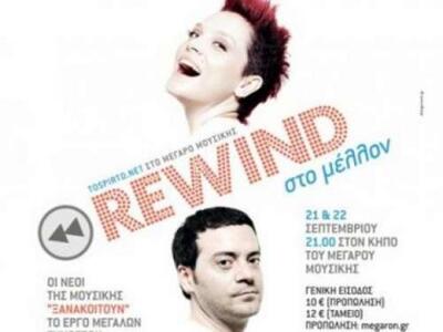 Δύο μεγάλες και ιδιαίτερες συναυλίες θα φιλοξενήσει το Μέγαρο Μουσικής Aθηνών στον καταπράσινο κήπο του σε συμπαραγωγή με το tospirto.net του Λάκη Λαζόπουλου. Στις συναυλίες με τίτλο «Rewind στο μέλλον» θα εμφανιστούν δύο από τους πιο επιτυχημένους ερμηνευτές της νέας γενιάς, η Ελεωνόρα Ζουγανέλη και ο Πατρινός Vassilikos, οι οποίοι θα παρουσιάσουν το ρεπερτόριο δύο αγαπημένων και ευρέως καταξιωμένων συνθετών του ελληνικού τραγουδιού, την Παρασκευή 21 Σεπτεμβρίου και το Σάββατο 22 Σεπτεμβρίου αντίστοιχα.