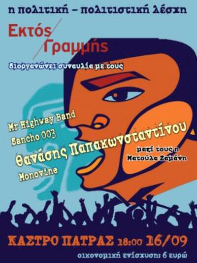 Λόγω κακών καιρικών συνθηκών, η προγραμματισμένη συναυλία της Λέσχης "Εκτός Γραμμής" μετατέθηκε για την Τετάρτη 19/09 και ώρα 18:00 στο Κάστρο Πάτρας. Στο πλευρό του Θανάση Παπακωνσταντίνου θα εμφανιστούν η Ματούλα Ζαμάνη και τα συγκροτήματα Mr. Higway Band, Sancho 003 και Monovine.