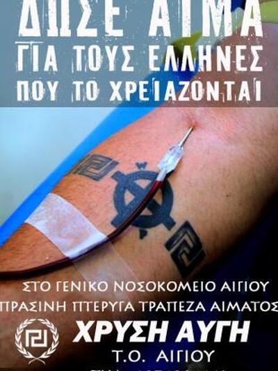 Τράπεζα αίματος δημιούργησε και στο Αίγιο η Χρυσή Αυγή. Όπως ανακοινώνει, "στα πλαίσια των δράσεων κοινωνικής αλληλεγγύης της Χρυσής Αυγής και της Πράσινης Πτέρυγας, τα μέλη της Τ.Ο. Αιγίου της Χρυσής Αυγής, δημιούργησαν τράπεζα αίματος στο Αίγιο, στο πρότυπο παρόμοιων δράσεων σε όλη την Ελλάδα.