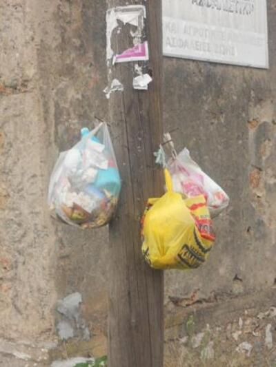 Κάρφωσε πρόκες στο στύλο της ΔΕΗ και εκεί πάνω κρεμάει τις σακούλες των σκουπιδιών. Έτσι η «άχαρη» κολώνα μεταμορφώθηκε σε χρηστικό αντικείμενο και ο χώρος διατηρείτε καθαρός, αφού οι σακούλες είναι ψηλά και δεν τις φτάνουν... οι γάτες!!