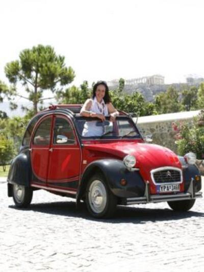 Σε φωτογραφίες, που δημοσιεύει το lykavitos.gr, η κυρία Διαμαντοπούλου ποζάρει μέσα σε ένα Citroen 2CV αυτοκίνητο, ανέμελη με φόντο την Ακρόπολη.