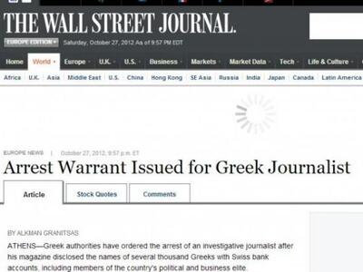"Οι ελληνικές αρχές έχουν διατάξει τη σύλληψη ενός δημοσιογράφου, μετά την αποκάλυψη από το περιοδικό του ονομάτων αρκετών χιλιάδων Ελλήνων με ελβετικούς τραπεζικούς λογαριασμούς, συμπεριλαμβανομένων μελών του πολιτικού χώρου και της επιχειρηματικής ελίτ της χώρας.