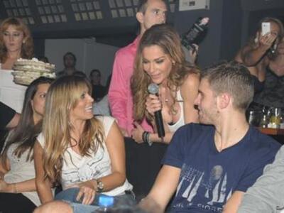 Δεν είναι μία τυχαία τραγουδίστρια εκείνη η οποία μπήκε ανάμεσα στο ζευγάρι, αλλά μία πολύ διάσημη συνάδελφός της Κοκκίνου και από τις καλύτερες φίλες της! Ο φωτογραφικός φακός την "τσάκωσε" μάλιστα σε μία ιδιαίτερα αποκαλυπτική πόζα της... Και βέβαια η Βανδή, όπως βλέπετε, μπήκε στην κυριολεξία ανάμεσα στο ζευγάρι, αλλά για να τους αφιερώσει μερικά από τα τραγούδια της στο "Ποσειδώνιο". Η... αποκαλυπτική πόζα που λέγαμε είναι η επόμενη, όπου η τραγουδίστρια σκύβει από πάνω τους στο ύψος του κεφαλιού του Μπόγρη, αλλά εκείνος δεν "καρφώνεται"! Ή τουλάχιστο έτσι νομίζουμε εμείς, αν και η Δέσποινα σ' αυτή τη στάση "κολάζει" και παντρεμένο, πόσο μάλλον έναν - απλά - δεσμευμένο...