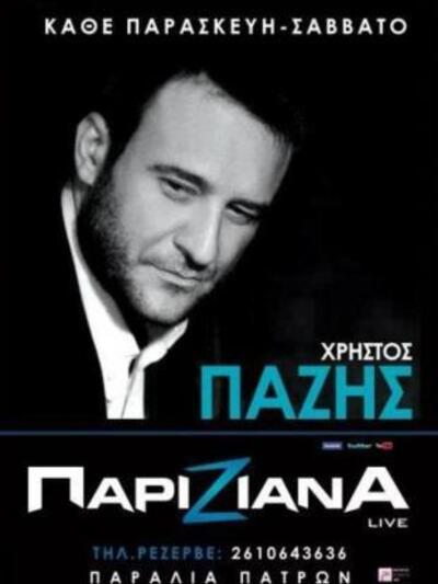 Ένας γνωστός λαικός τραγουδιστής, ο Χρήστος Πάζης που έχει αρκετές μεγάλες επιτυχίες όπως το κομμάτι «Χαλαρά» που είχε ακουστεί πολύ στα ραδιόφωνα, ξεκινάει εμφανίσεις στην Πάτρα, κάθε Παρασκευή και Σάββατο στο κέντρο Παριζιάνα Live στην Παραλία κοντά στου Τσαούση.