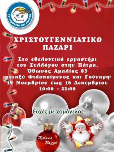 O Εθελοντικός Οργανισμός «Το Χαμόγελο του Παιδιού» διοργανώνει το 9ο Χριστουγεννιάτικο Bazaar που θα πραγματοποιηθεί στο εθελοντικό του εργαστήρι που βρίσκεται στον 4ο όροφο του χώρου των γραφείων του στην Πάτρα και στην οδό Όθωνος Αμαλίας 83 (μεταξύ Φιλοποίμενος και Γούναρη), από Δευτέρα 19 Νοεμβρίου 2012 έως και Κυριακή 16 Δεκεμβρίου 2012 καθημερινά 10:00-22:00